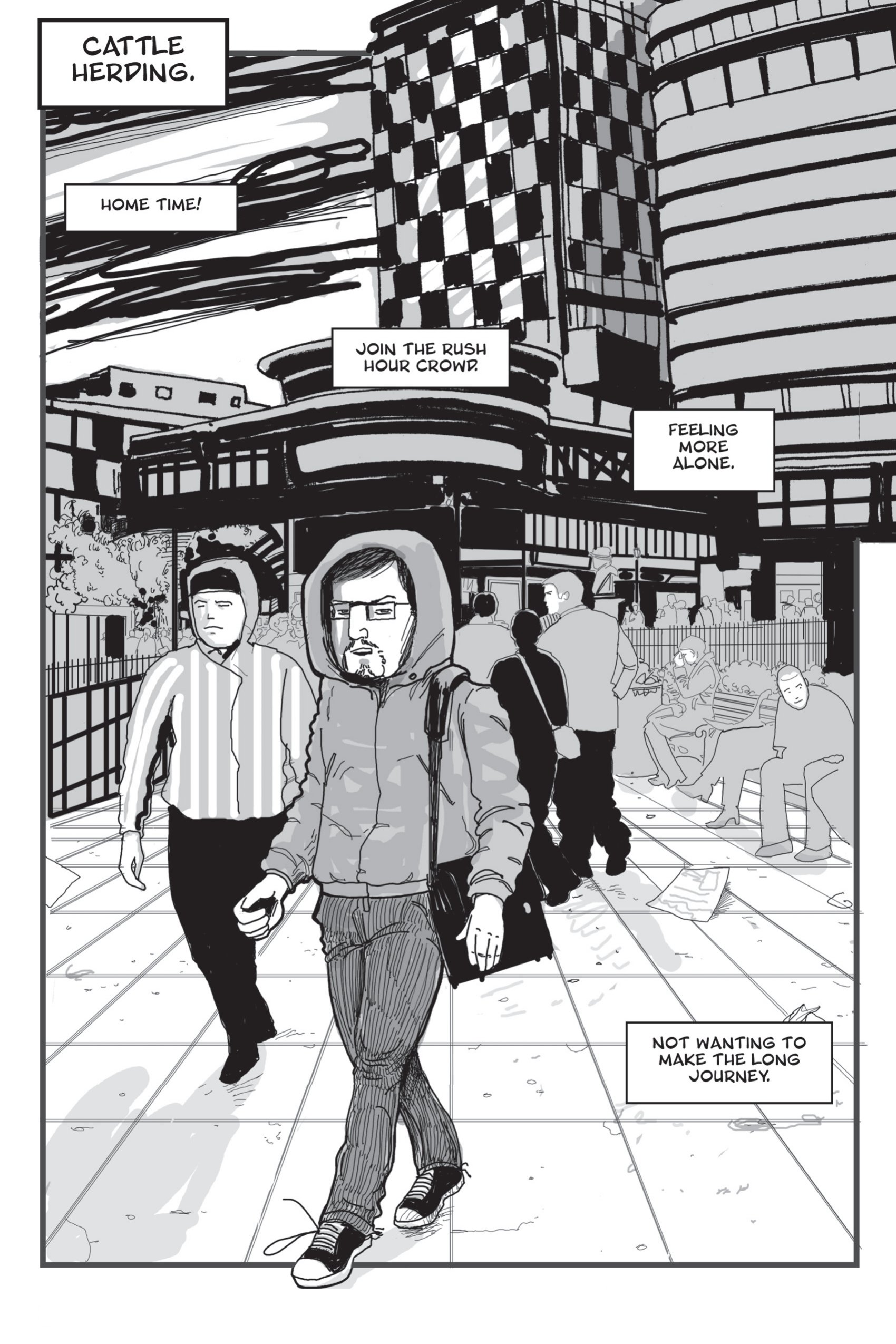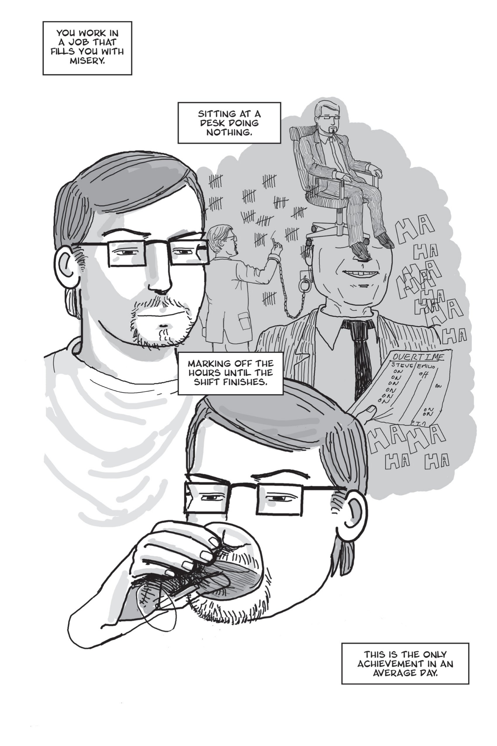 Running to over 140 pages, it’s the story of Steve Jones, an artist who struggles through a series of tedious, menial jobs for sustenance, leaving his creative time squeezed into evenings and weekends. It’s a tale drawn from life but with plenty of the surreal thrown in for good measure (as you’ll see from the samples on his blog).